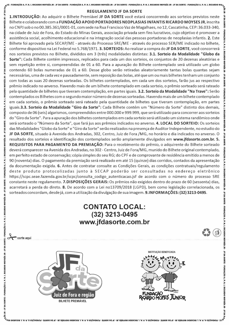 Ao adquirir o JF DA SORTE você colabora com a FUNDAÇÃO RICARDO MOYSÉS JR., ajudando na assistência às crianças e adolescentes portadores de câncer e, ainda, concorre a valiosos prêmios. Os bens oferecidos como prêmio são meramente ilustrativos. O BILHETE PREMIÁVEL JF DA SORTE, é uma promoção aprovada pela SEAE/ME. Antes de contratar, consulte previamente o Regulamento/Condições Gerais.